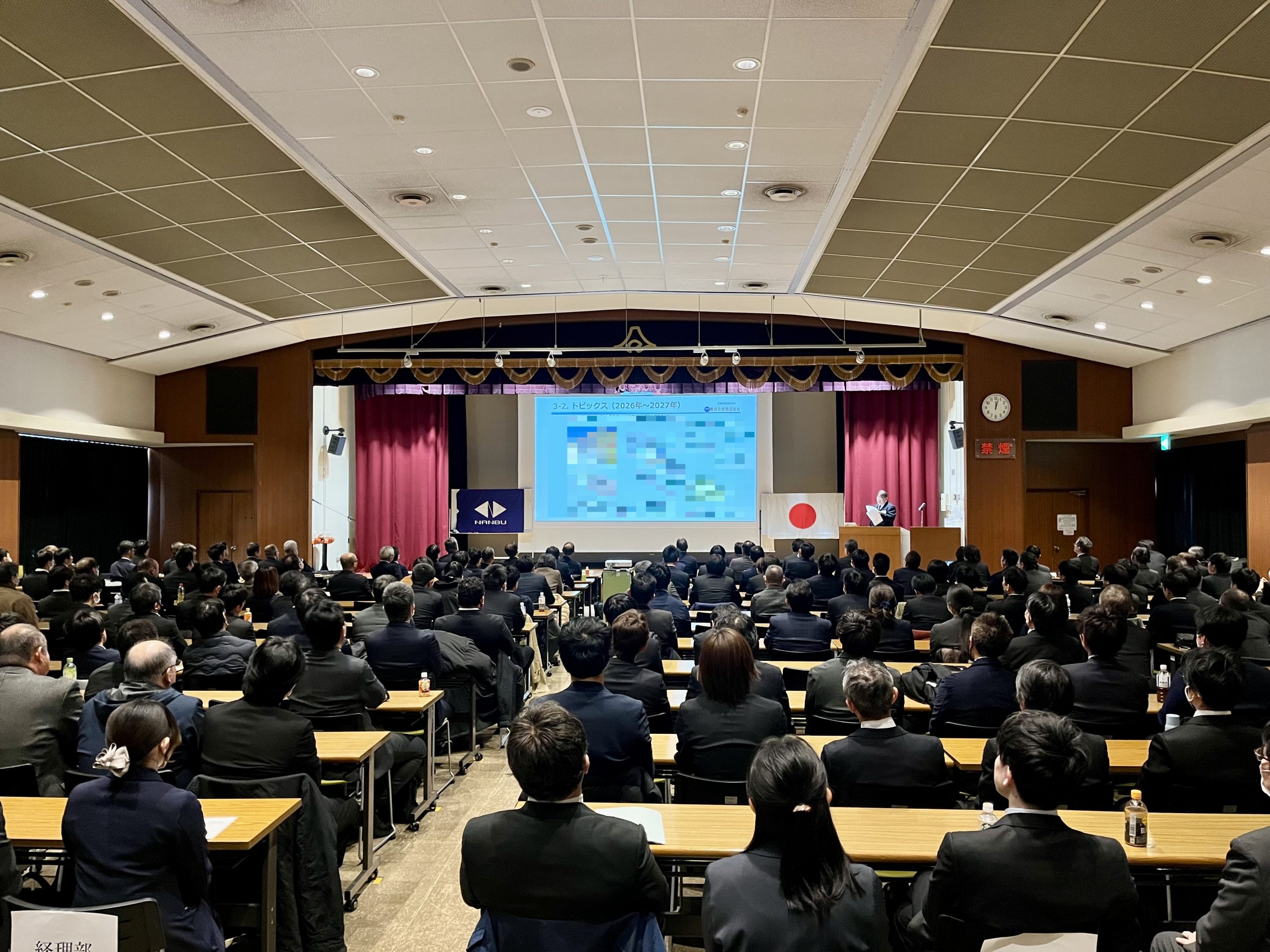 南部化成株式会社(本社:静岡県榛原郡吉田町、社長:黒田 寿)は、1月24日に静岡労政会館にて2026年度 南部化成経営方針発表会を開催しました。発表会には、来賓の皆さまならびに南部化成の役員および社員約250名が出席し、来賓挨拶に続いて、社長および南部化成グループ各社を含めた各幹部からの方針発表、分野ごとの拠点表彰や社員の永年勤続表彰などを執り行いました。