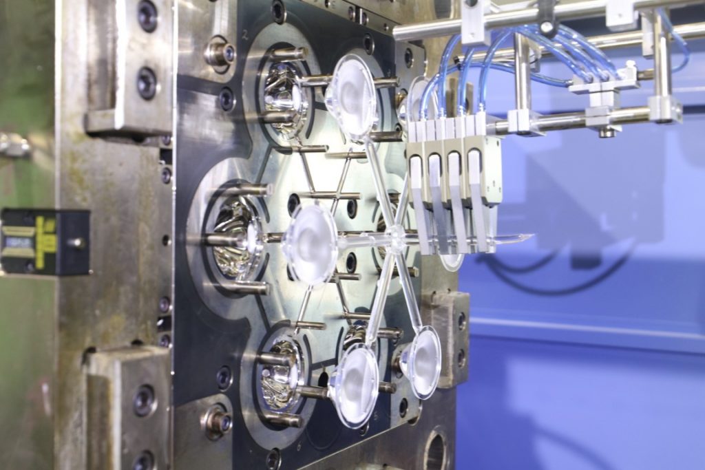 350t~450tクラスの成形機を保有し、厚肉透明成形専用ラインを完備しております。全体空調による温度管理を行うことで、より高品質の透明成形品の生産が可能となっており、自動ゲートカットなどによる省人化を実現しております。